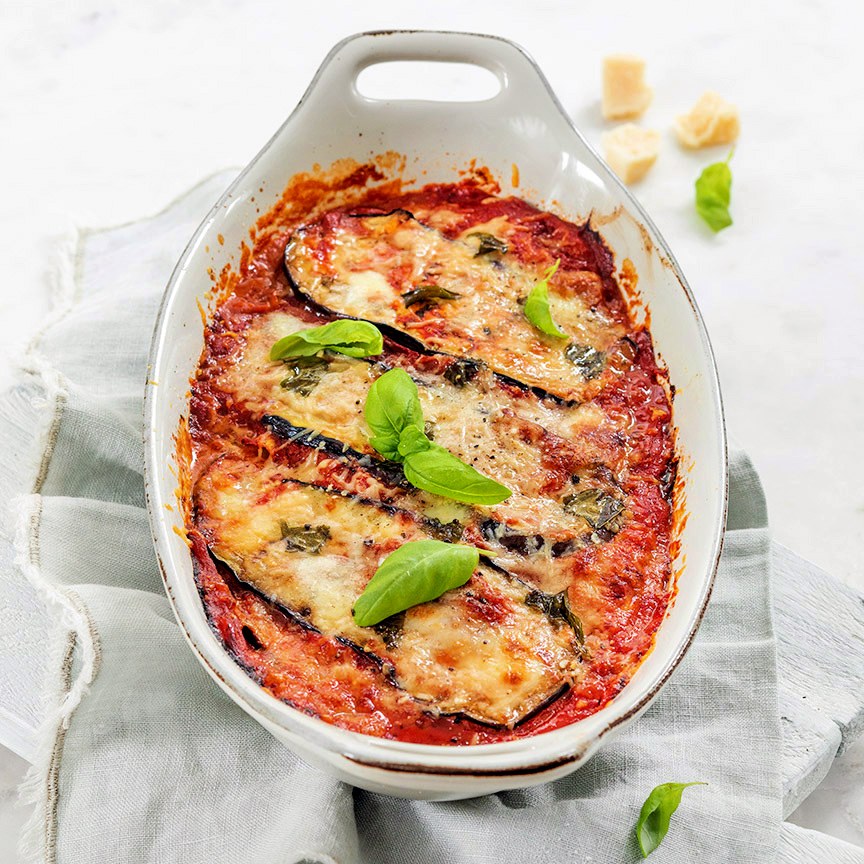 3. Vet de ovenschaal in met een beetje olie. Beleg de bodem van de ovenschaal met plakken gegrilde aubergine. Verdeel hier wat tomatensaus, mozzarella en Parmezaanse kaas over. Herhaal dit totdat de ingrediënten op zijn en eindig met de kaas. Zet de schaal ongeveer 25 minuten in de oven. Verdeel voor het serveren nog wat verse basilicumblaadjes over de schotel.