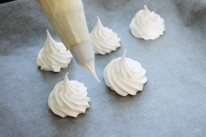 4. Gebruik een spuitzak om mooie toefjes eiwit op het bakpapier te maken. Je kunt ook met een lepel kleine hoopjes op het bakpapier scheppen, zo krijg je wat meer ronde en bolle schuimpjes. De hoopjes zetten niet uit tijdens het bakken dus je kunt ze vrij dicht bij elkaar doen. Zet de bakplaat 1½ uur in de oven.