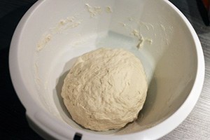 1. Doe de bloem in een kom en voeg het gist toe. Maak een kuil in het midden en voeg het warme water daarin toe. Kneed het deeg tot een egale bol en leg in de kom. Dek de kom af met een iets vochtige doek en zet hem op een redelijk warme plek in het huis (bij de verwarming bijvoorbeeld). Laat 1 uur rijzen. Verwarm de oven op 230 graden. Verdeel het gerezen deeg in 8 bolletjes (2 of 3 grote kan natuurlijk ook). Rol een deel deeg dun uit op een bakplaat met bakpapier. Hoe dunner hoe krokanter de bodem.