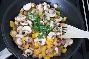 1. Verwarm de oven op 200 graden. Bak de spekreepjes in een pan. Voeg de paprika in blokjes en champignons in plakjes toe. Bak 5 minuutjes en voeg de peterselie toe. Laat de groenten en spekjes eventueel uitlekken als er veel vocht of vet vrij is gekomen.
