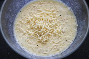 2. Vet de springvorm in. Bekleed de springvorm in met bladerdeeg en prik wat gaatjes in de bodem. Bestrooi de bodem met een dun laagje paneermeel. Klop de eieren los met room en breng op smaak met een snufje peper. Voeg de geraspte kaas toe en meng er samen met de gebakken spekjes en groenten doorheen.