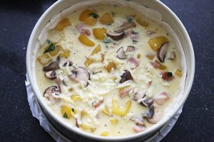3. Giet het mengsel in de bekleedde springvorm. Bak de quiche met champignons 35 minuten in de oven tot hij gaar is. Serveer de quiche warm. Als avondmaal eventueel met een kop soep of een salade.