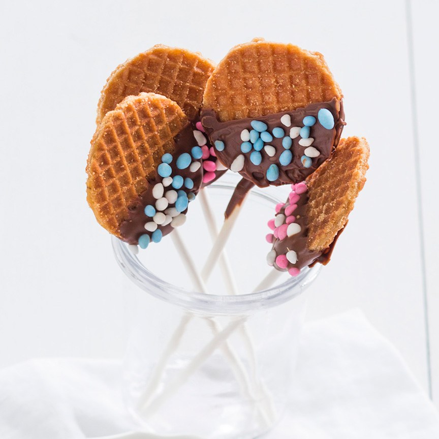Leuk en makkelijk kraamhapje van kleine stroopwafels met een laagje chocolade en blauwe of roze muisjes, lekker voor de babyshower.