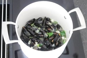 4. Tips: vervang de witte wijn, peper en zout door bouillon om een versie te maken van mosselen zonder alcohol.