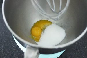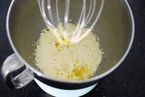 2. Klop de eidooiers met de helft van de suiker en citroenschil 3 minuutjes door elkaar tot het schuimig begint te worden.