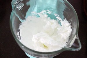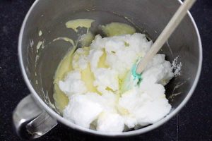 4. Klop de eiwitten stijf met de andere helft van de suiker met een schone en vetvrije mixer en kom. Mix daarna in een andere kom de slagroom stijf. Spatel eerst de slagroom door het citroen-limoncello mengsel en als laatste de opgeklopte eiwitten.