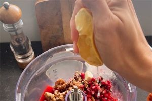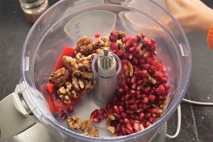 1. Doe de geroosterde paprika, walnoten en granaatappels in een keukenmachine.