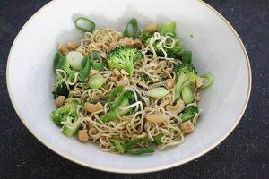 Noedels met zalm teriyaki en broccoli