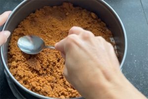1. Maal de koekjes fijn in een keukenmachine. Smelt de boter of margarine en voeg toe aan de koekkruimels en meng door elkaar. Bekleed de bodem van de springvorm met bakpapier. Verdeel de koekkruimels hierover en druk aan met de bolle kant van een lepel. Zet de vorm zolang in de koelkast.