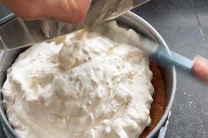 4. Verdeel het mengsel over de koekbodem en strijk de bovenkant glad. Zet minimaal 4 uur in de vriezer.
