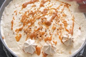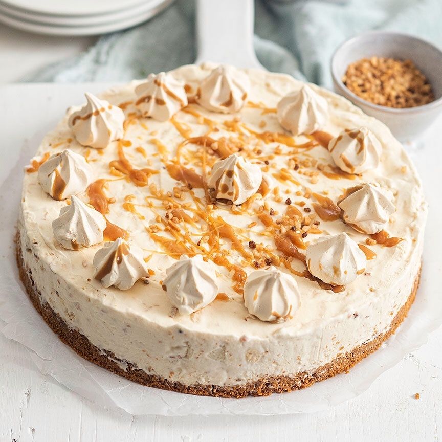5. Haal de taart uit de vriezer en garneer met wat karamelsaus in het midden en bestrooi eventueel met wat extra nougatine.
