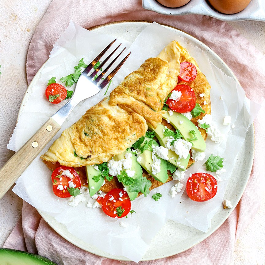 7. Verdeel de pesto over de omelet en leg hierop de tomaatjes, avocado en de rest van de verse peterselie.