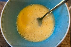 2. Klop de eieren los met een garde samen met amandelmelk en een snuf peper en zout.