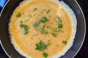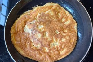 4. Giet vervolgens het eimengsel erin. Ongeveer 1-2 minuten later strooi je hier de helft van de peterselie op. Bak de omelet aan beide kanten gaar.