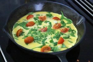 1. Verwarm de oven op 200 graden. Doe de eieren en melk met een snuf peper en zout in een kom. Kluts door elkaar. Verhit een boter of margarine in een middelgrote (ovenvaste) koekenpan en schenk het eiermengsel hierin. Verdeel de spinazie erover en de in vieren gesneden cherrytomaten.