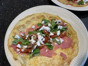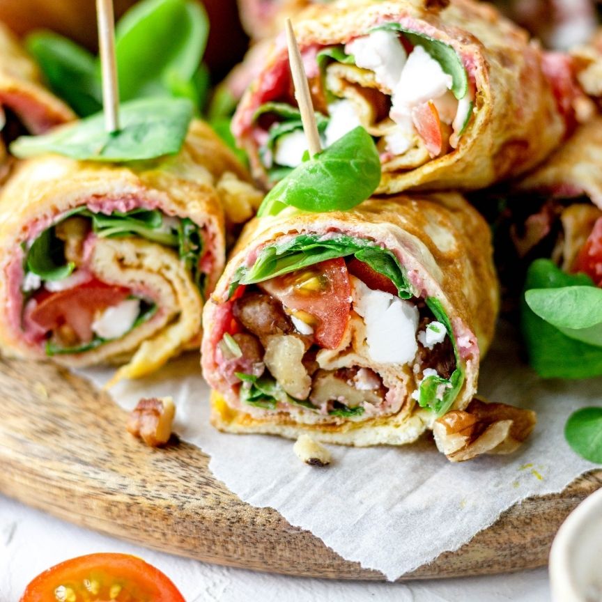 2. Snijd de cherry tomaatjes in 4. Bestrijk de afgekoelde omeletten met de hummus en verdeel de tomaatjes, walnoten rucola en feta erover. Rol de omeletten strak op en verpak ze in vershoudfolie. Laat minimaal 1 uur opstijven in de koelkast.