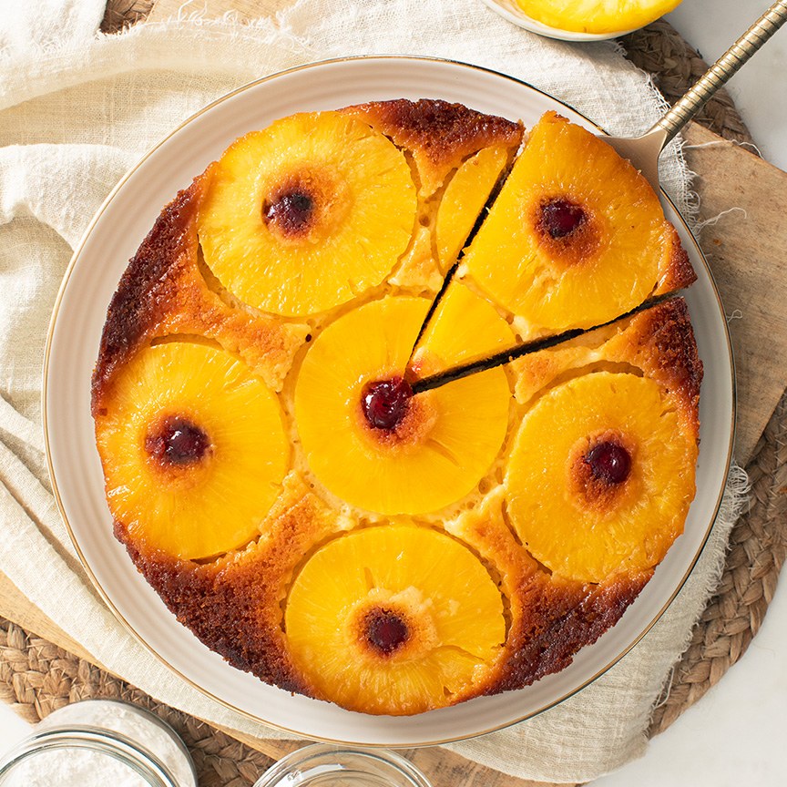 7. Haal de ananascake uit de oven en laat een paar minuten afkoelen. Keer hem voorzichtig om op een bord en verwijder het bakpapier. Laat hem geheel afkoelen of serveer hem nog iets warm met bijvoorbeeld een bolletje ijs.