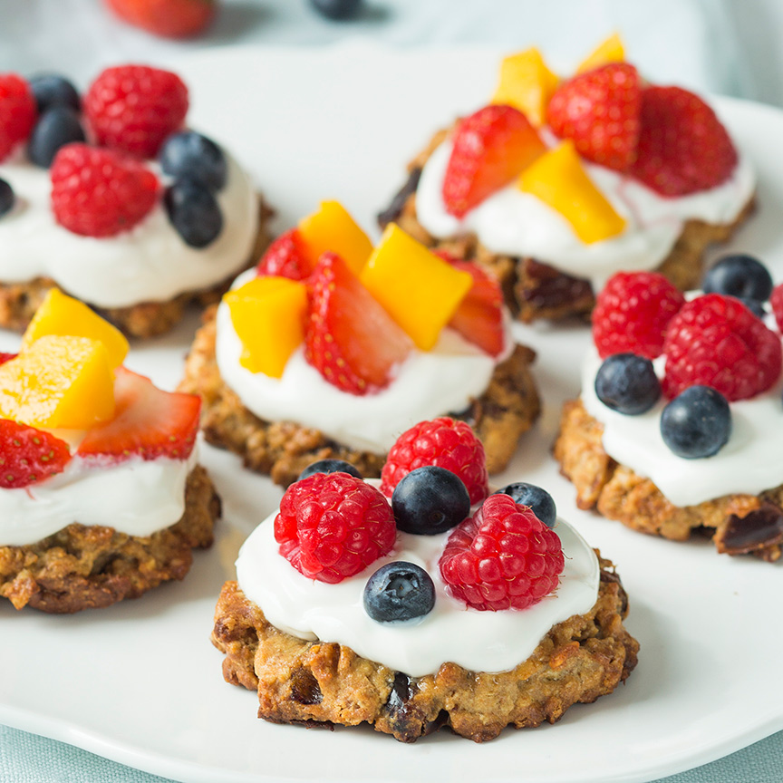6. Als de koekjes afgekoeld zijn, schep je op elk koekje een lepel Griekse yoghurt of kwark. Verdeel er daarna kleurrijk vers fruit over naar keuze, zoals aardbeien, blauwe bessen of mango.