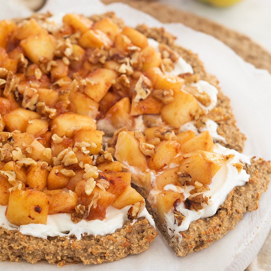 5. Verdeel dan de kwark als topping over de havermout bodem. Verdeel de appeltjes en stukjes walnoot over de pizza met kwark. Snijd de ontbijtpizza in punten en smullen maar!