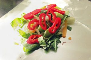 3. Verdeel de roerbakgroenten en paprika over 2 stukken aluminiumfolie.
