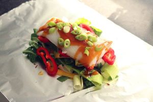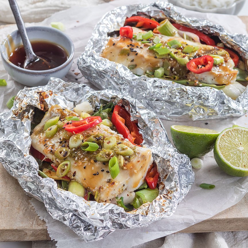 7. Vouw de pakketjes goed dicht en leg ze 15 min. in de oven of ca. 10 min op een hete BBQ.