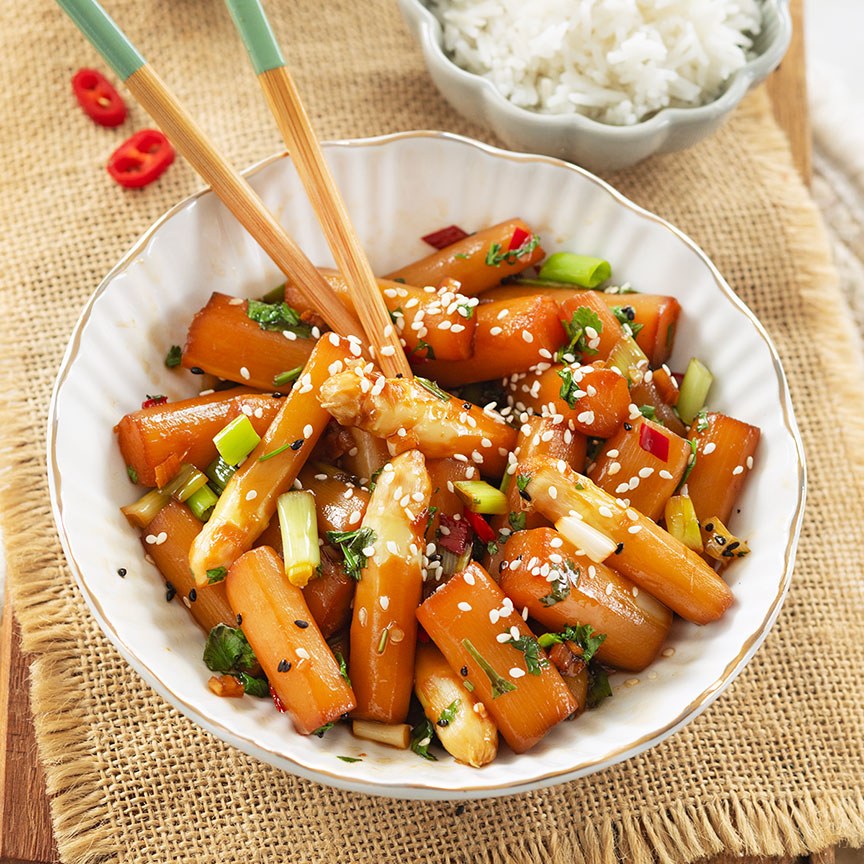 5. Net voor het serveren, strooi de sesamzaadjes en de rest van de bosui over het gerecht. Garneer met verse koriander of peterselie voor een frisse touch.