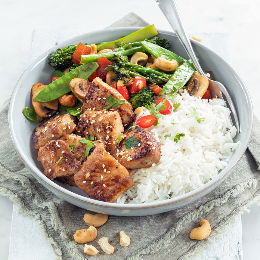 4. Serveer de roerbakgroenten met de vis en rijst. Garneer met wat cashewnoten. Ook lekker met kroepoek.