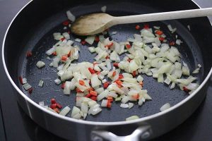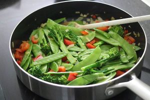 2. Fruit een gesnipperde ui, knoflook en rode peper in een wokpan met wokolie. Voeg de champignons, paprika, bimi en peultjes toe.