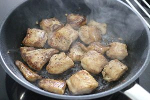 3. Voeg de oestersaus en ketjap toe en bak al omscheppend 10 minuten. Bak ondertussen de gemarineerde panga stukjes ongeveer 5 minuten op hoog vuur in een koekenpan.