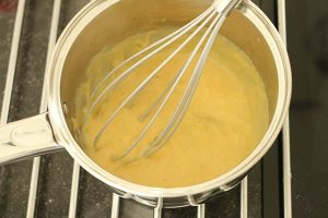 3. Roer het custardpoeder met 2 eetlepels melk en de suiker tot een papje. Verwarm de rest van de melk in een pannetje en giet het custardpapje er bij. Verwarm al roerend met een garde door. Als de custard pudding genoeg is ingedikt zet je het vuur uit.