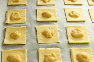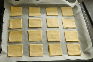 2. Snijd de bladerdeegvelletjes in vieren zodat je kleine vierkantjes hebt.