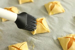7. Klop het eitje los en bestrijk de oranje bladerdeeghapjes aan de bovenzijde.