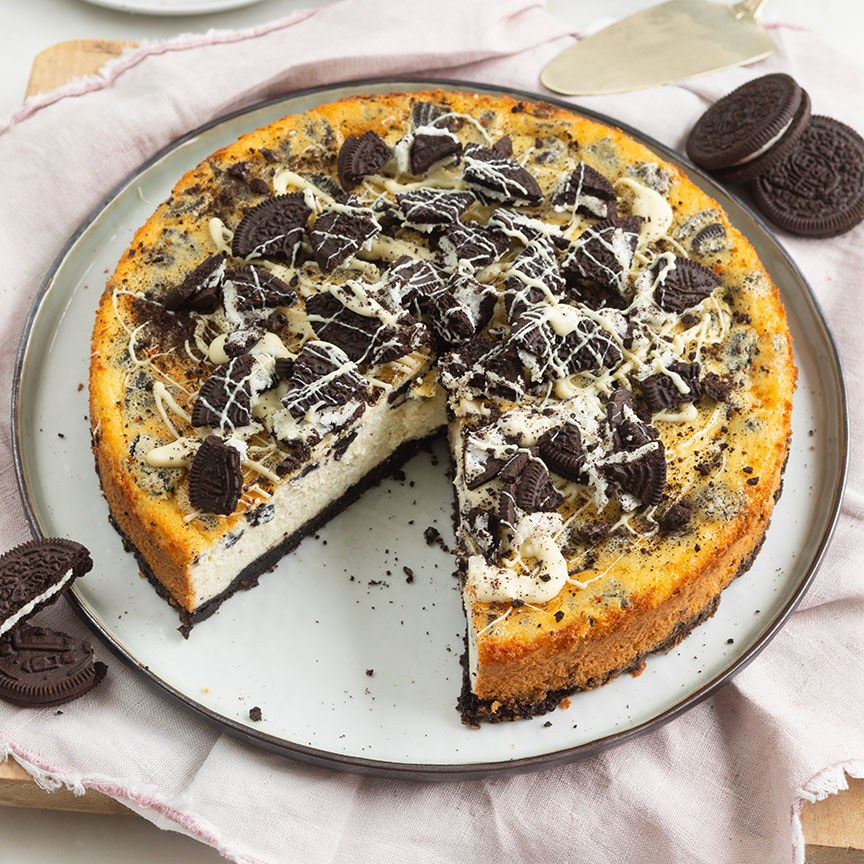 8. Smelt de witte chocolade au bain marie. Hak of breek de Oreo koekjes grof die bij de topping vermeld staan. Verdeel een beetje chocolade over de bovenzijde van de cheesecake. Verdeel hier de Oreo stukjes over en maak het af met wat extra chocolade. Eventuele scheurtjes in de cheesecake kun je hiermee ook handig verdoezelen.