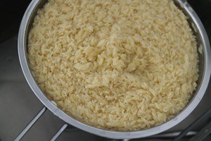 3. Giet de orzo af en spoel af met koud water. Laat de orzo goed uitlekken en doe in een grote kom.
