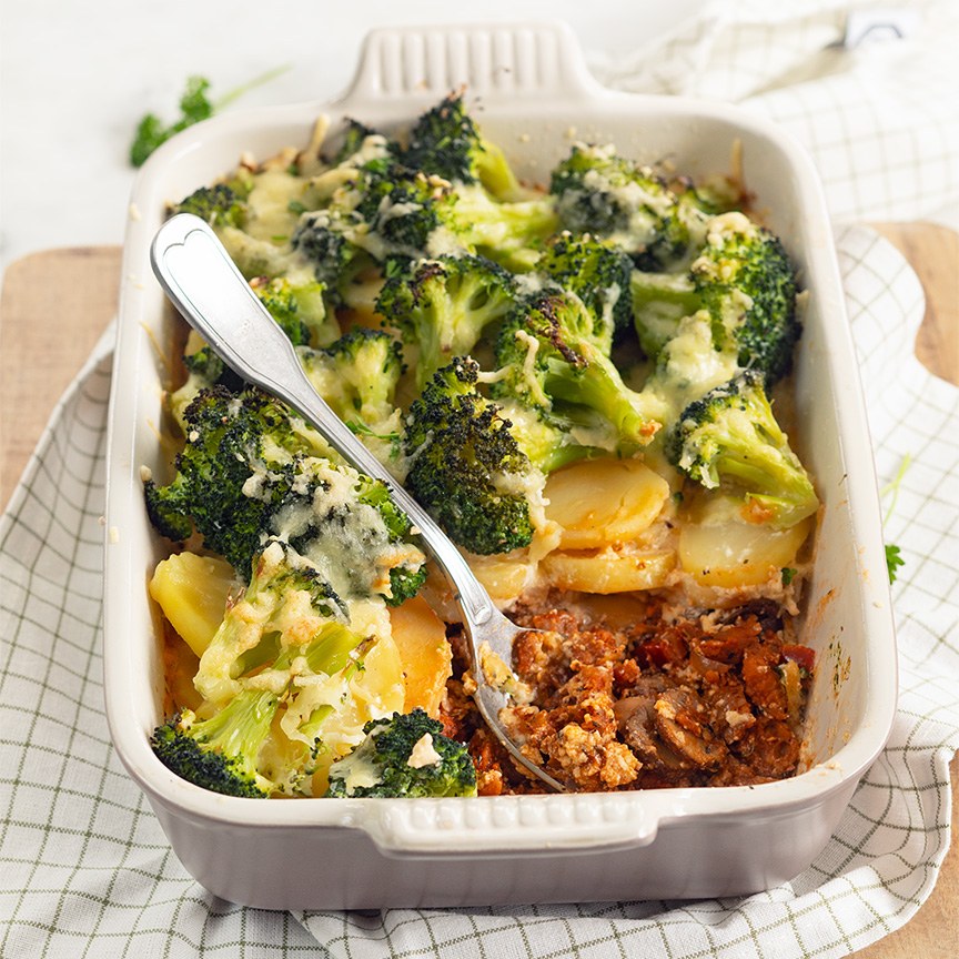 1. Start met het voorverwarmen van je oven op 200 graden. Snijd de broccoli in roosjes en blancheer deze kort, zo’n 4 minuten. Gebruik je geen kant en klare voorgekookte aardappelschijfjes dan kun je deze ook een paar minuten in water of magnetron voorkoken zodat ze zeker gaar en zacht worden in de oven.