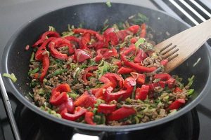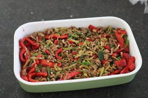 1. Verwarm de oven op 200 graden. Rul het gehakt bruin in een pan met een beetje olie of boter. Snijd de puntpaprika in reepjes en bak even mee met het gehakt. Voeg ook de prei toe en de tomatenpuree en cajunkruiden. Meng alles goed door elkaar.
