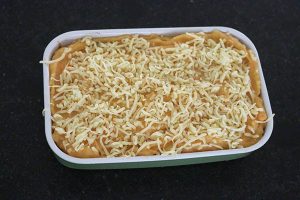 2. Breng het mengsel eventueel op smaak met een snufje peper en zout. Doe het gehaktmengsel in een ovenschaal en dek af met een laagje zoete aardappelpuree. Bestrooi met een beetje kaas en bak ca. 20 minuten in de oven tot de kaas mooi gesmolten is.