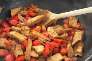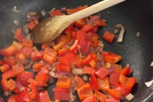 5. Voeg de paprika in blokjes toe en roerbak even mee.