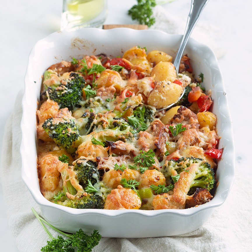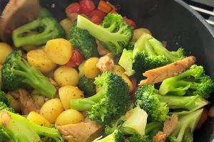 7. Doe dan de voorgekookte krieltjes en broccoli erbij en schep alles nogmaals goed door elkaar.