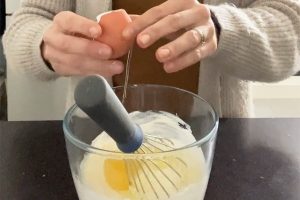 9. Klop de crème fraîche los in een kom. Roer het ei en de melk erdoorheen met een snufje peper en zout toe naar smaak.