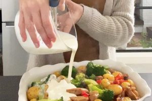 10. Giet het roommengsel over de ingrediënten in de ovenschaal.