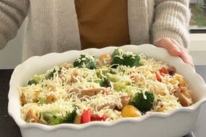 12. Controleer voor het serveren of alles goed gaar is en de ovenschotel niet meer vochtig is. Laat de ovenschotel met kip een paar minuten staan voordat je hem serveert.