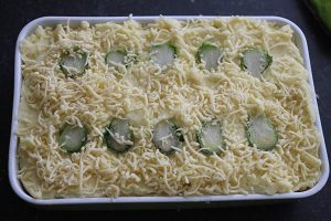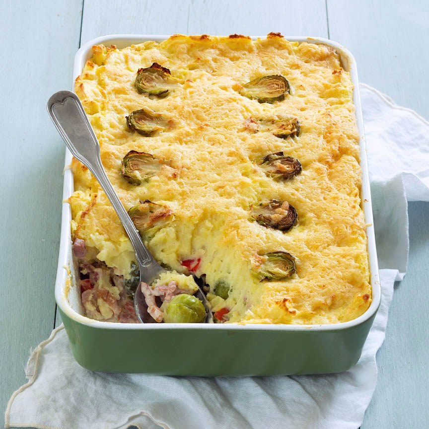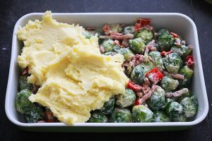 3. Dek af met de aardappelpuree. Snijd de overige spruitjes doormidden en verdeel over de bovenzijde van de ovenschotel. Bestrooi met kaas en zet de ovenschotel nog 20 minuten in de oven.