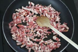 1. Verwarm de oven op 200 graden. Kook de aardappels in ca. 15 tot 20 minuten gaar. Kook ondertussen ook de spruitjes 10 minuten in een pan met water. Bak de spekjes licht krokant in een droge koekenpan. Voeg vervolgens ook de puntpaprika in stukjes toe.