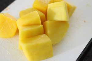 2. Snijd de mango in blokjes en houd een paar blokjes over voor de garnering. Voeg de overige mango ook bij in de blender. Blend tot een gladde smoothie. Garneer met mango blokjes en een beetje munt.