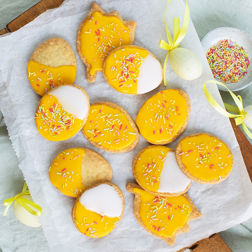4. Schuif de bakplaat met de paaskoekjes de oven in en bak de koekjes in 15 minuten goudbruin. Haal de bakplaat uit de oven en laat de koekjes erop afkoelen.