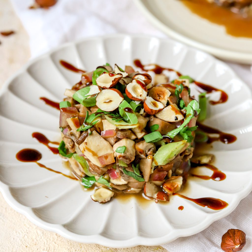 6. Zet een kookring (van 9-11 cm ongeveer) op een bordje en doe er de helft van het mengsel in. Druk goed aan en haal er dan vanaf zodat een tartaartje ontstaat. Top af met de balsamico, hazelnoten, overgebleven peterselie en lente ui.