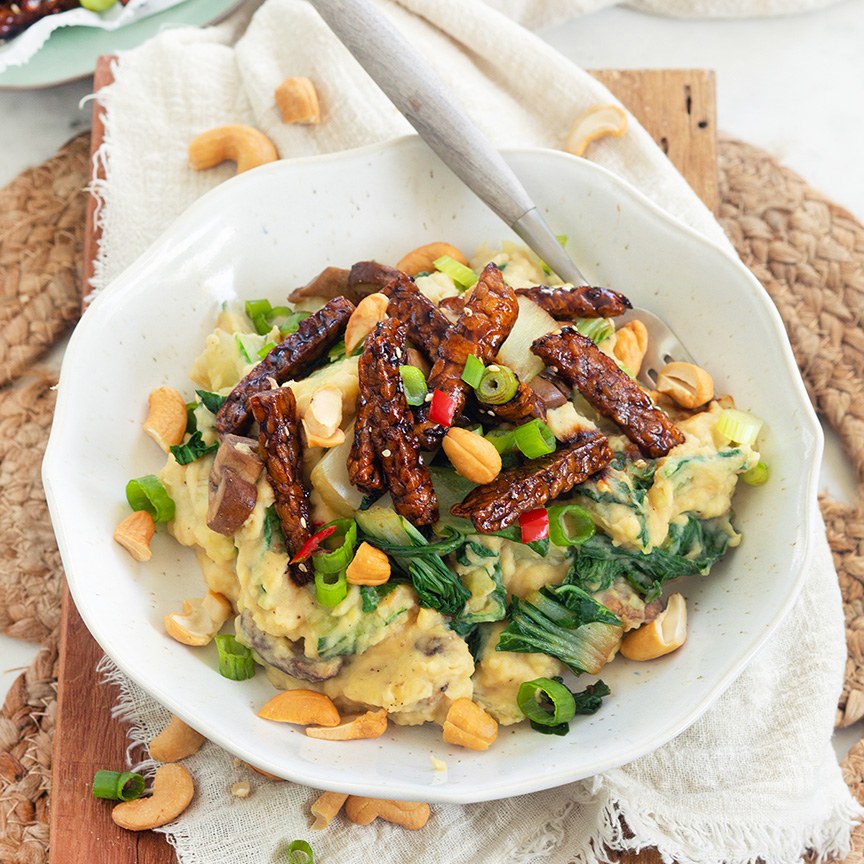 6. Serveer de stamppot met de gebakken tempeh erbovenop en eventueel wat extra cashewnoten.