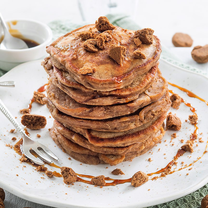 9. Klaar met bakken? Verdeel de pannenkoekenstapel over 2 of 3 borden. Besprenkel op en om de pancakes de stroop, honing, agave siroop of maple syrup en bestrooi met de pepernoten die je nog over hebt.