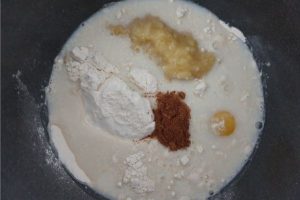 3. Neem een kom en voeg daar de gemalen pepernoten, het zelfrijzend bakmeel, het ei, de geprakte banaan, 1 tl speculaaskruiden en een snufje zout aan toe. Voeg ook een groot deel van de melk toe.